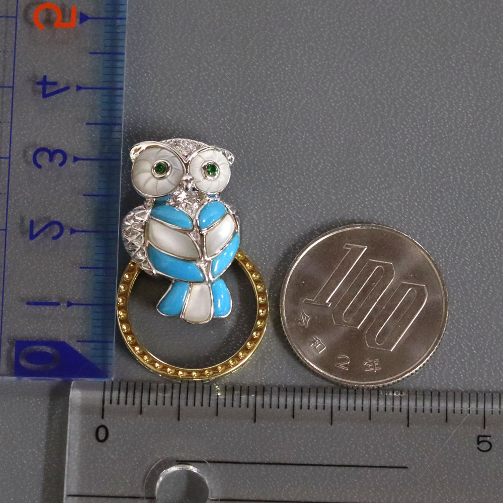 K18WG/K18マルチストーンペンダントトップ/リング フクロウモチーフ D0.02 G0.05 7.7g