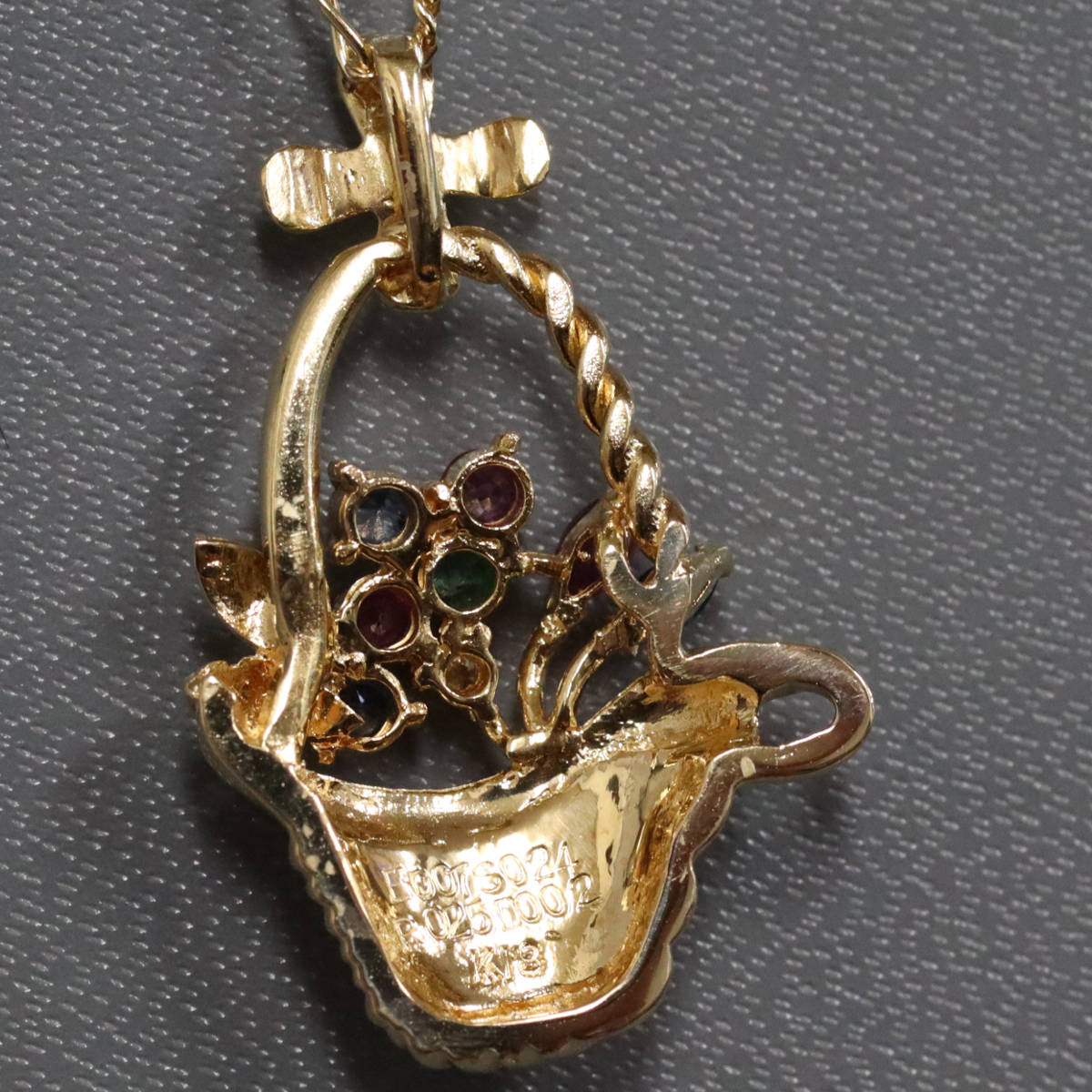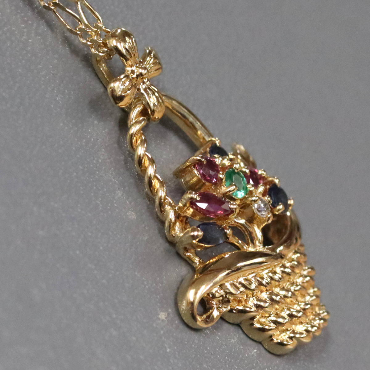 K18マルチカラーストーンペンダント フラワーバスケットモチーフ R0.25 S0.24 E0.07 D.02 7.4g