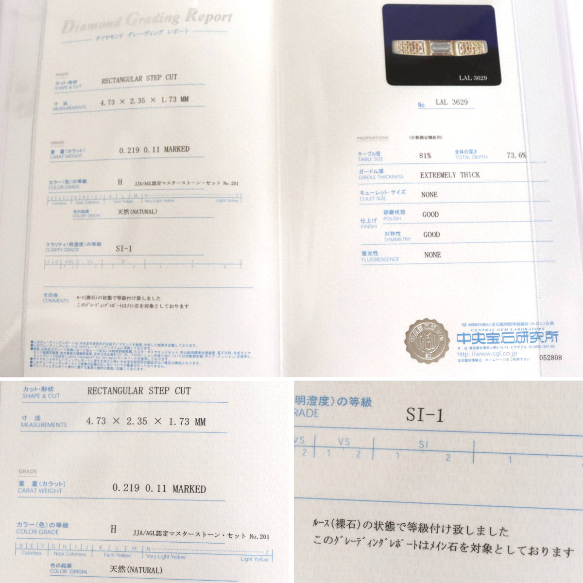 鑑定書が付属し、バゲットカットのダイヤモンドが、カラーH、クラリティSI-1と鑑定されています。
