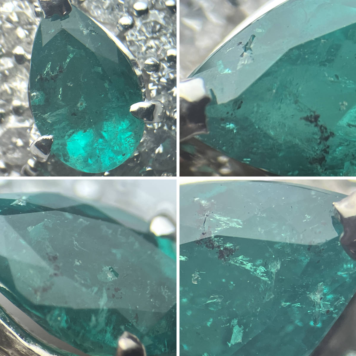 エメラルド・ダイヤモンド共にインクルージョンは多めで、カーボン状のものもあります。