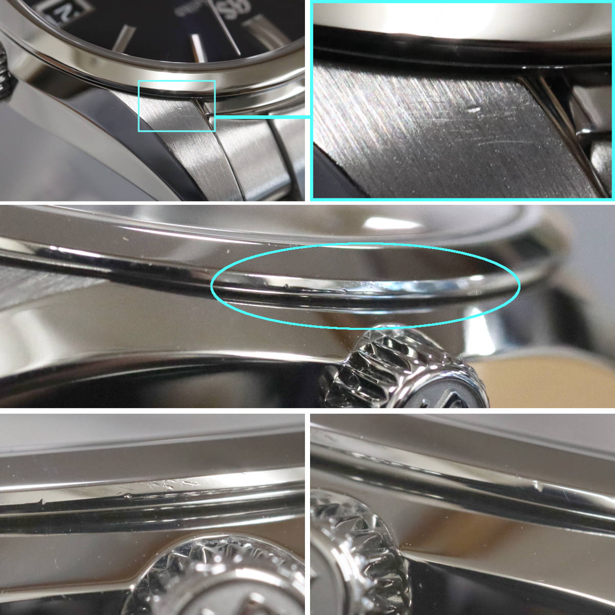 研磨仕上げが行われているようですが、ケースサイドやラグ、ベルトに部分的に傷残りがあります。