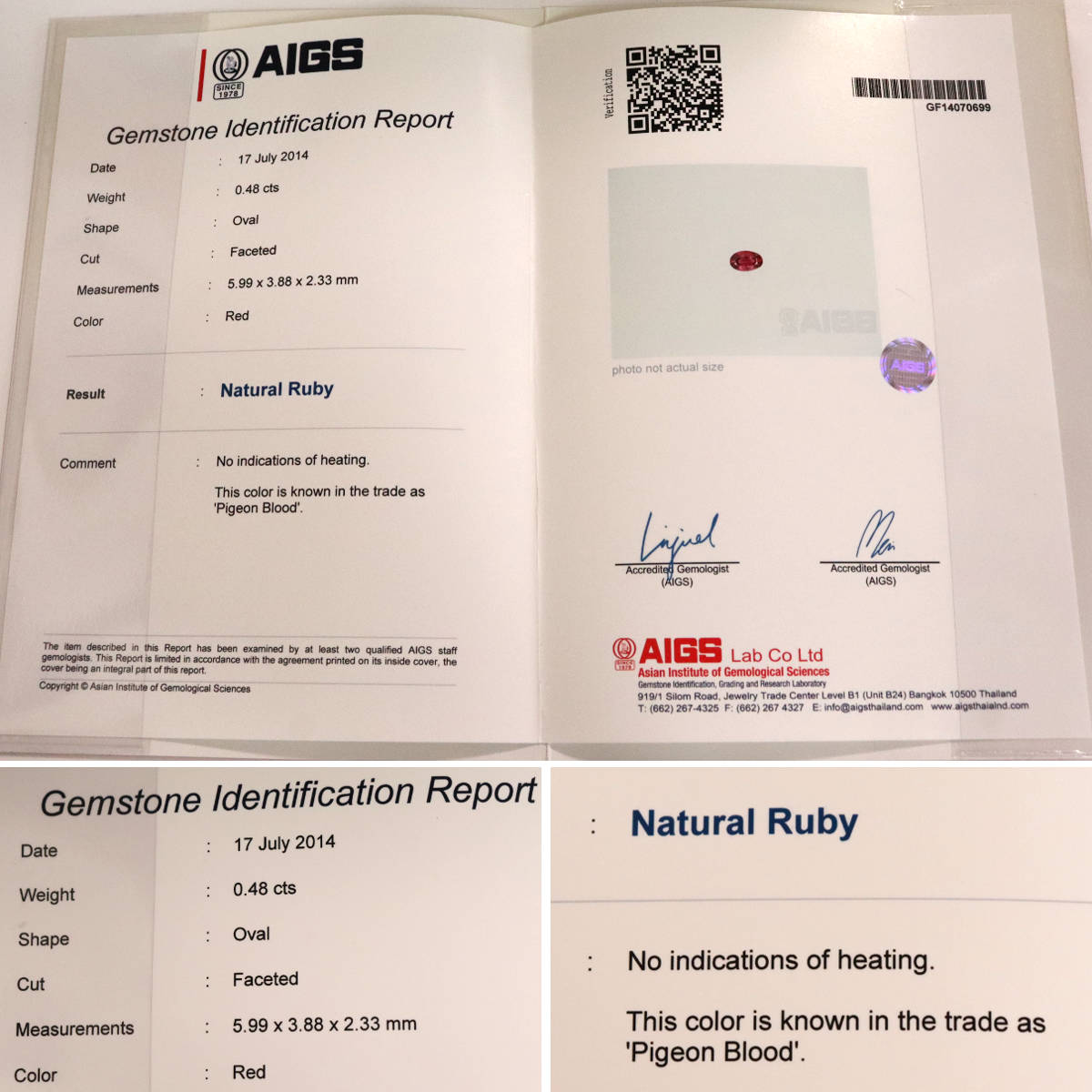 非加熱の天然ピジョンブラッドルビーと認める鑑別書が付属します。