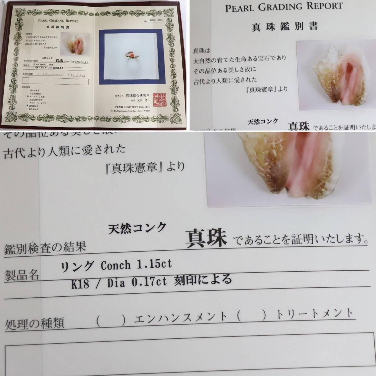 K18PGコンクパールダイヤモンドリング パール1.15 D0.17 4.5g #10.5 鑑別書