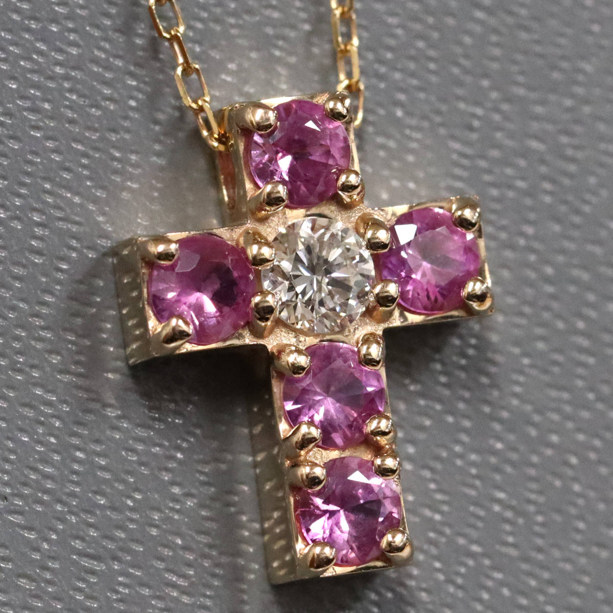 K18ピンクサファイアダイヤモンドネックレス クロスモチーフ PS0.65 D0.15 2.8g AJ付45cm