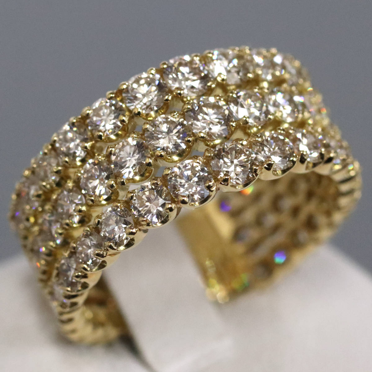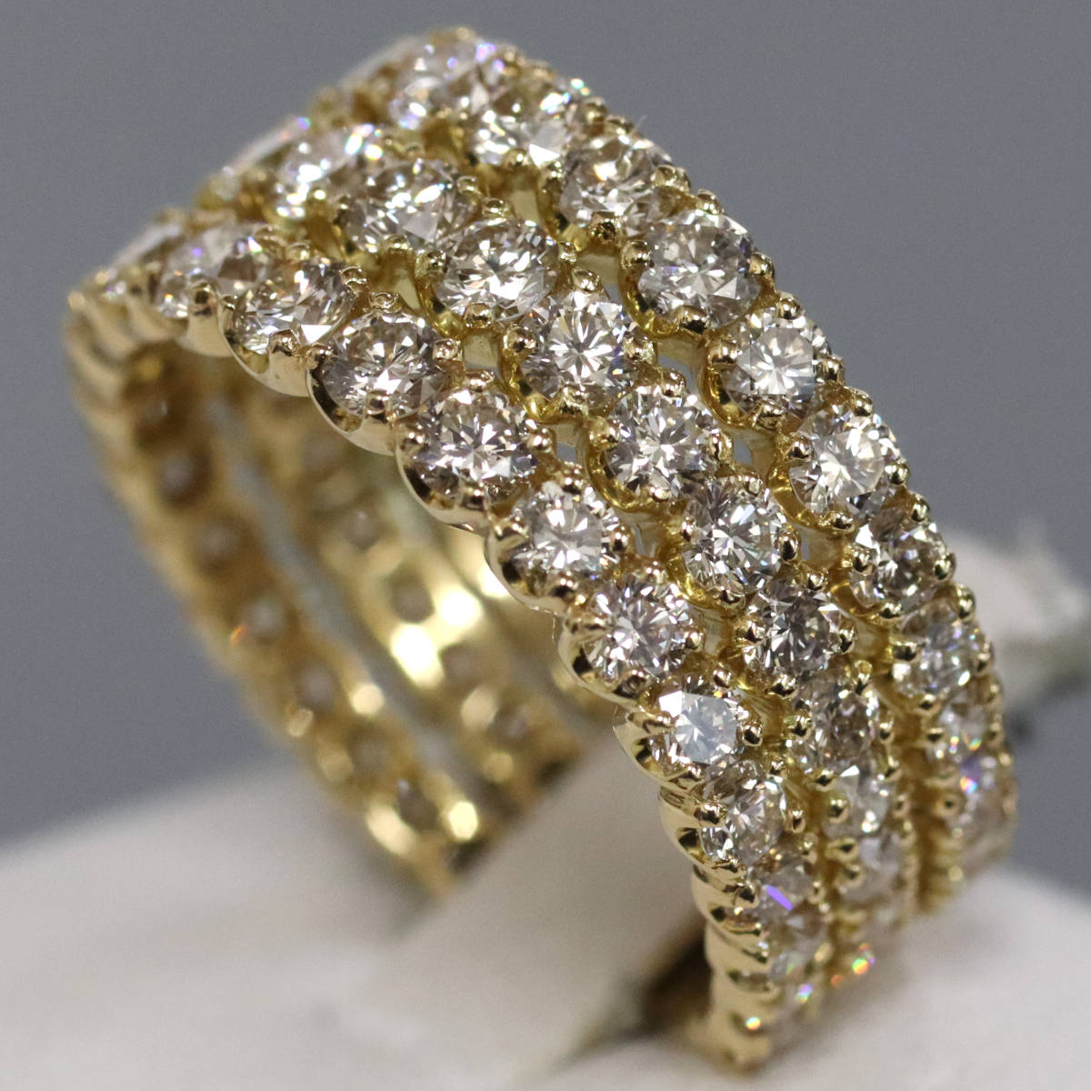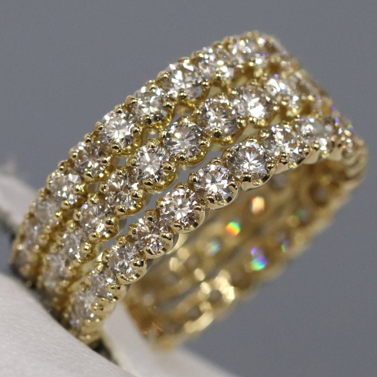 ダイヤモンドが3列で計3カラットも使用されたまばゆいリングです。