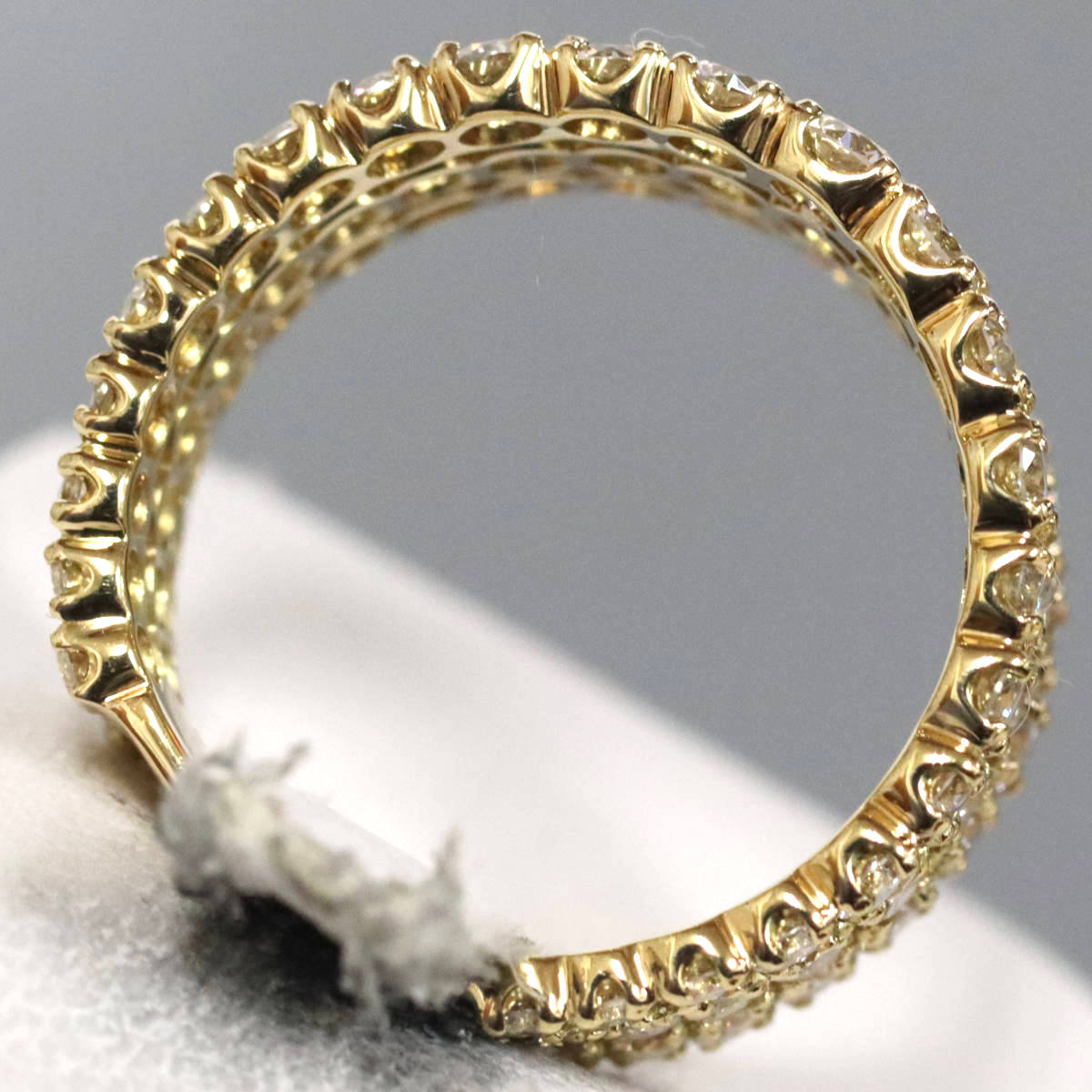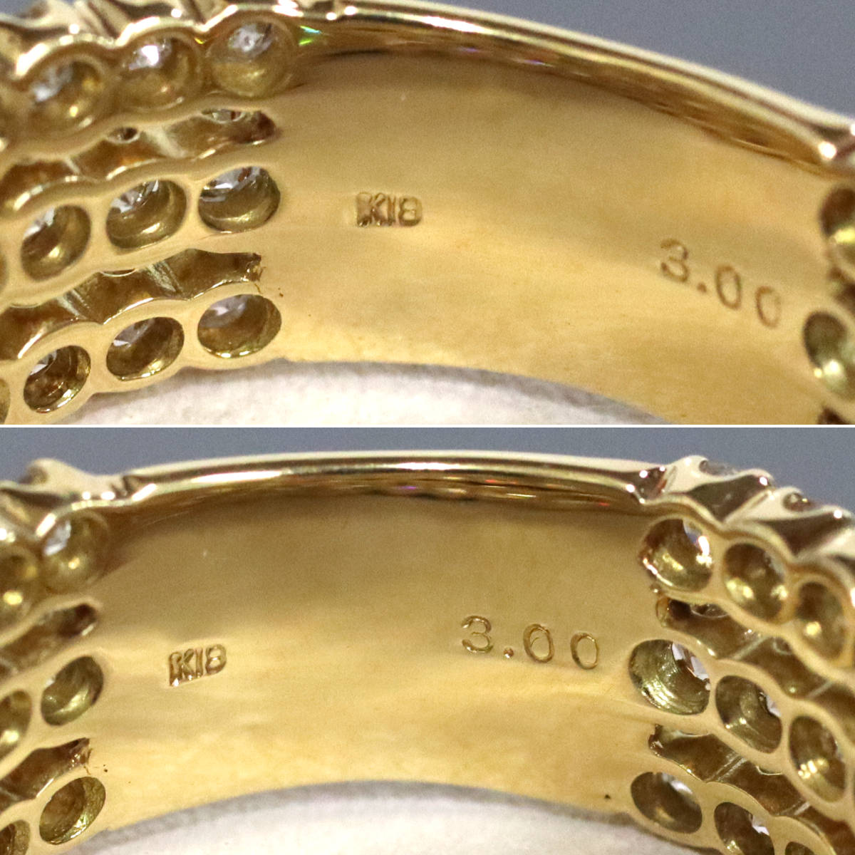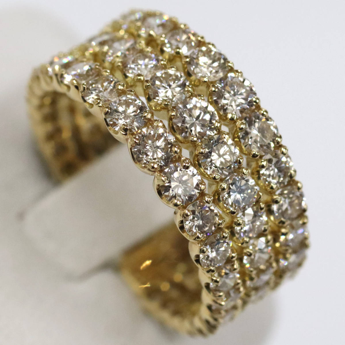 ダイヤモンドが3列で計3カラットも使用されたまばゆいリングです。