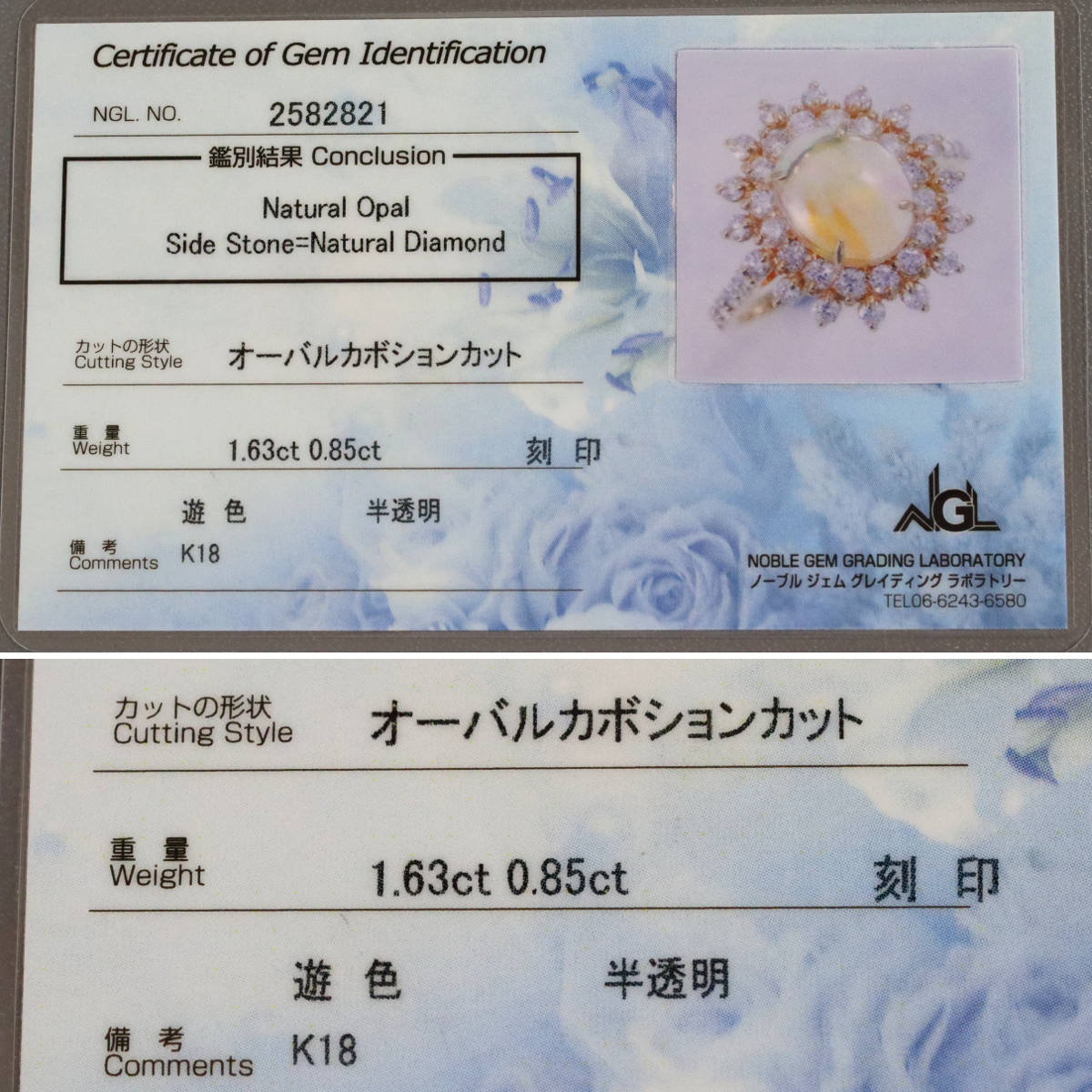 天然のオパール及びダイヤモンドと認める鑑別カードが付属します。