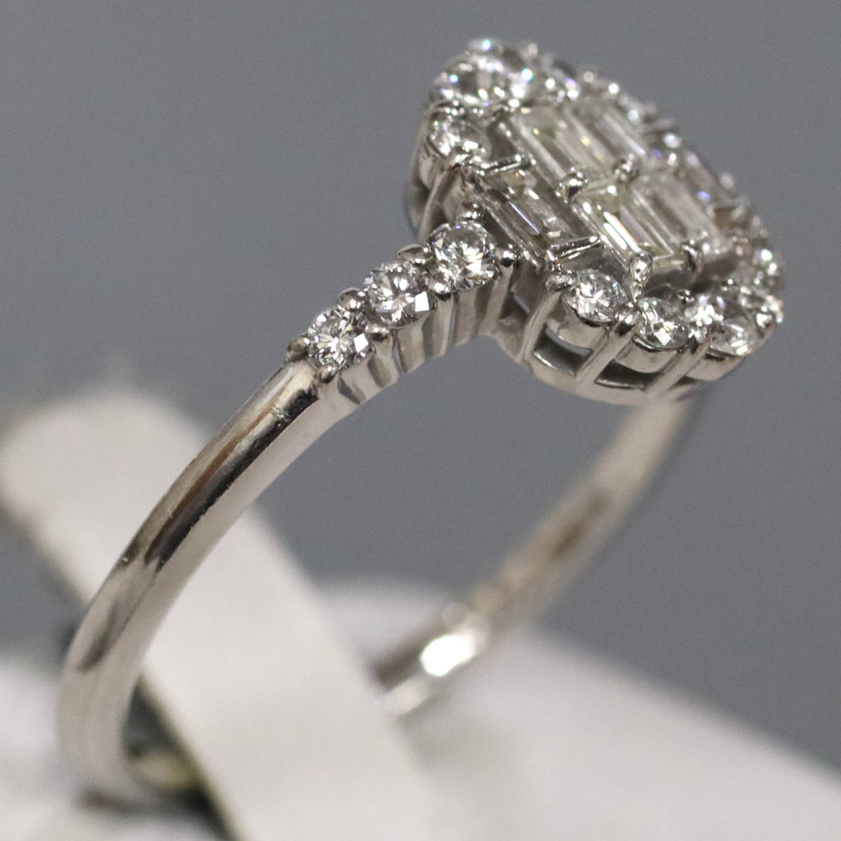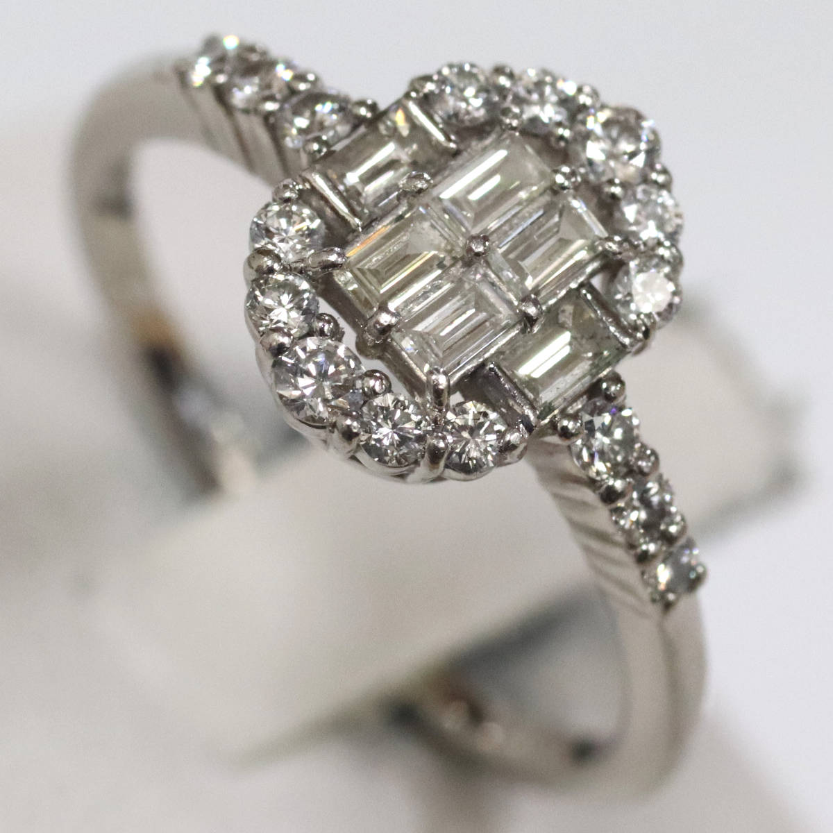 中央にはバゲットカット、周りにはラウンドブリリアントのダイヤモンドがセットされています。