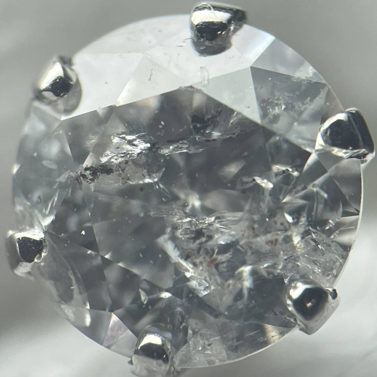 ダイヤモンドは無色に近い色味ですが、カーボン状のインクルージョンが多く見られます。