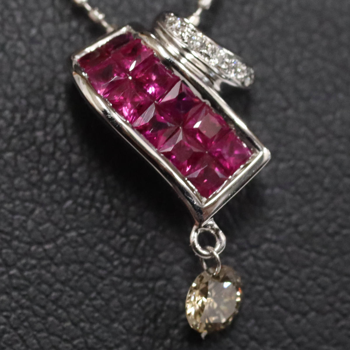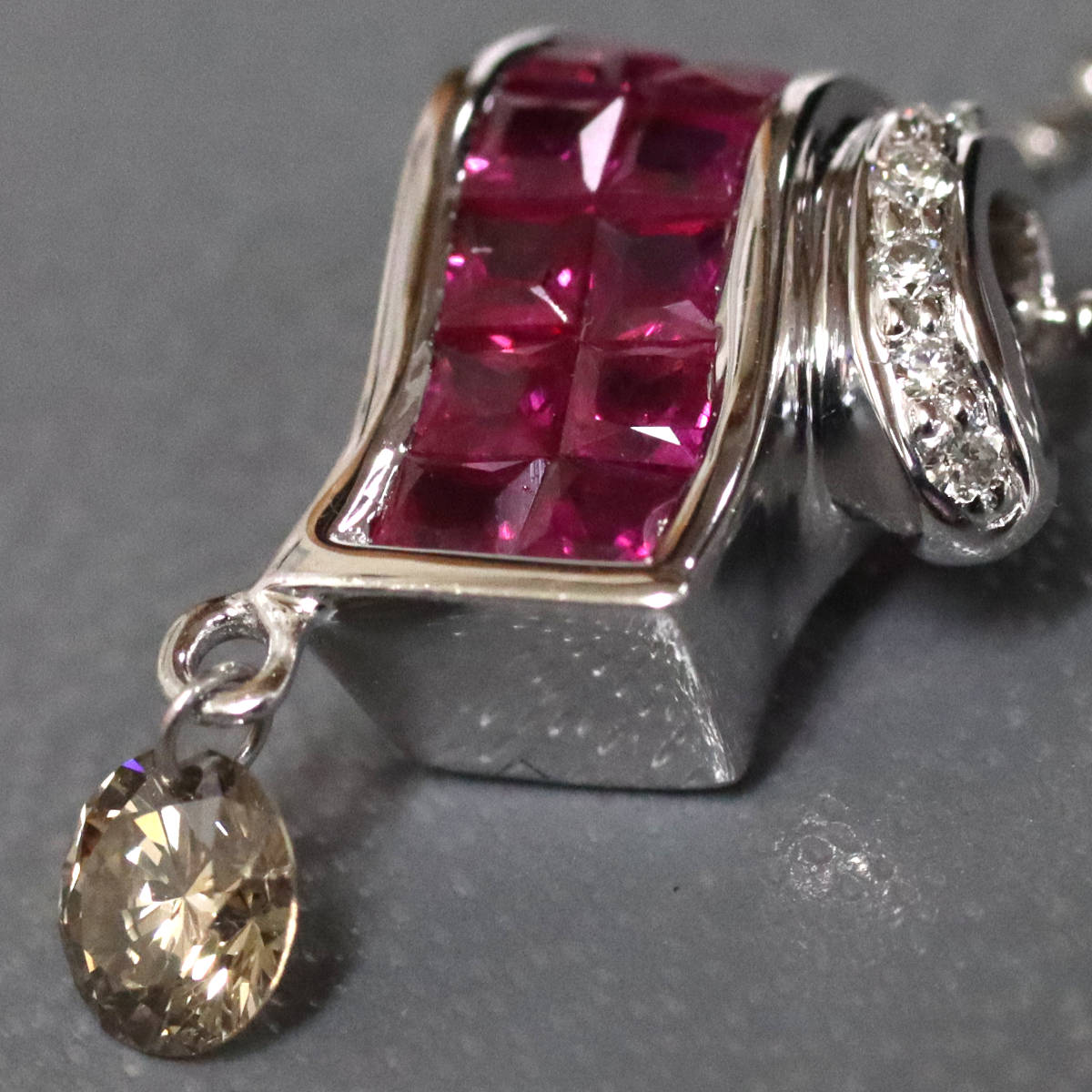 トップの下にぶら下がったダイヤモンドはわずかにインクルージョンがあり、ブラウンがかった色味です。