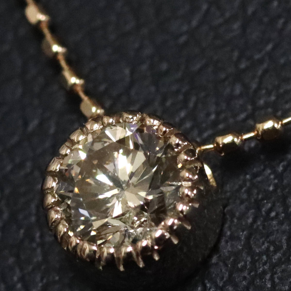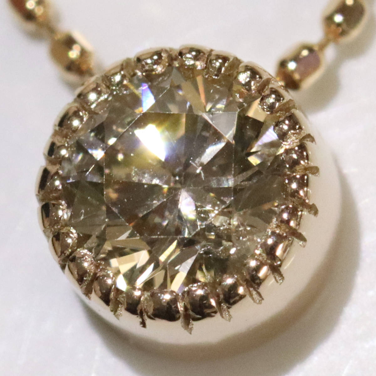 ダイヤモンドはブラウンがかった色味で、ややインクルージョンがありますが、照りよく輝きます。