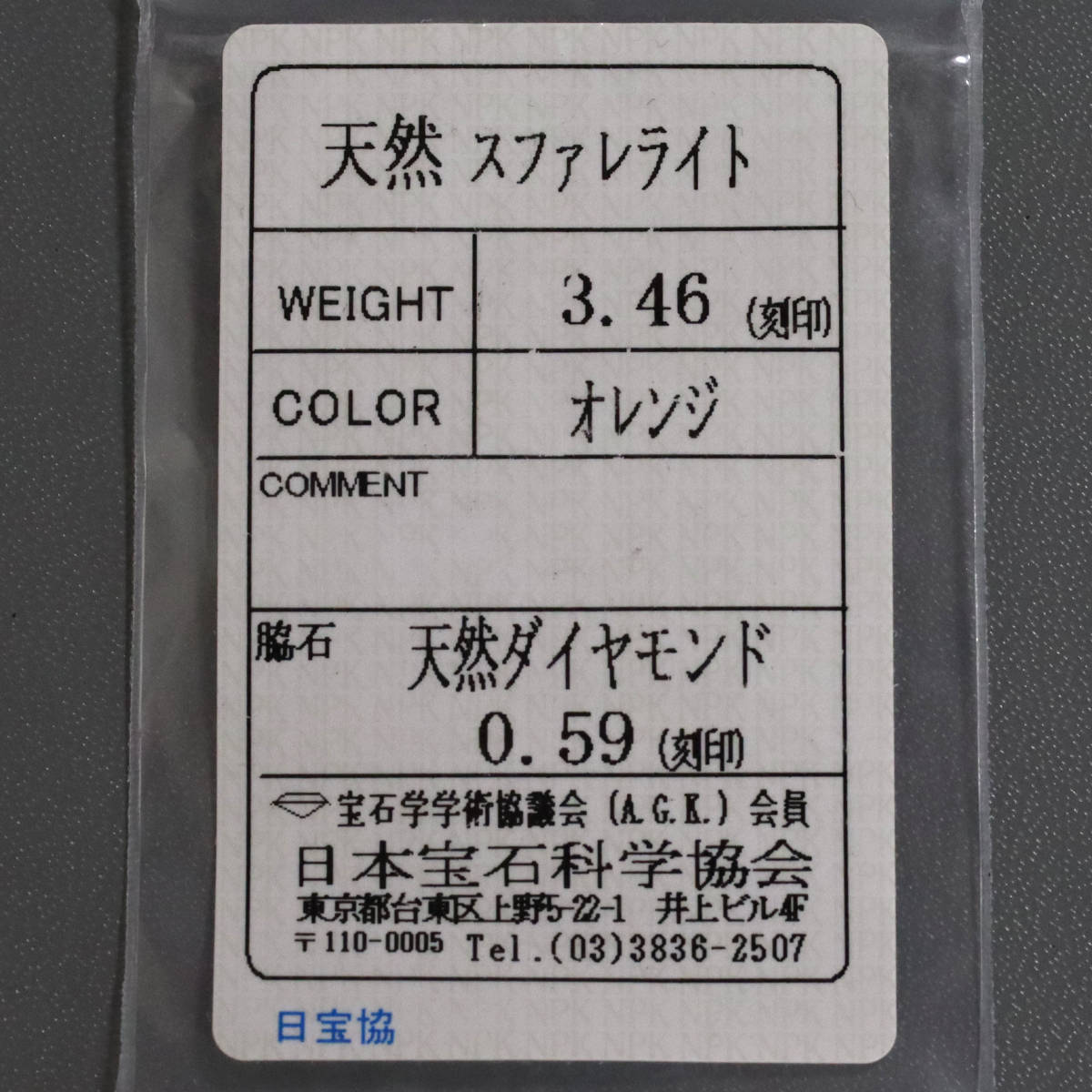天然のスファレライト・ダイヤモンドと認めるソーティングが付属します。