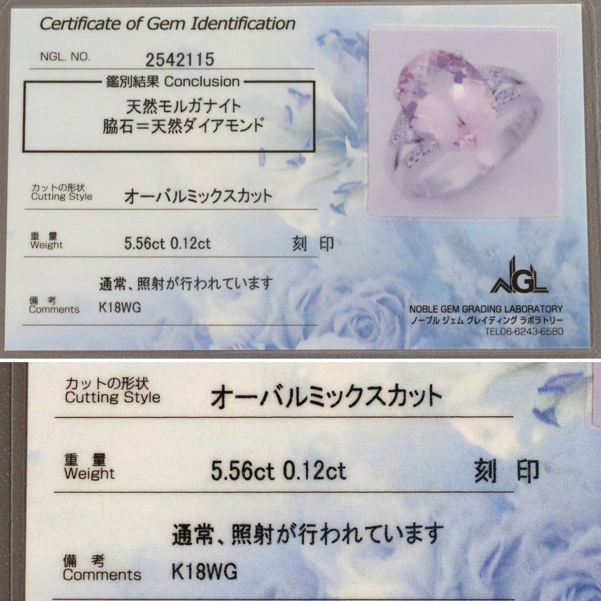天然のモルガナイト・ダイヤモンドと認める鑑別カードが付属します。