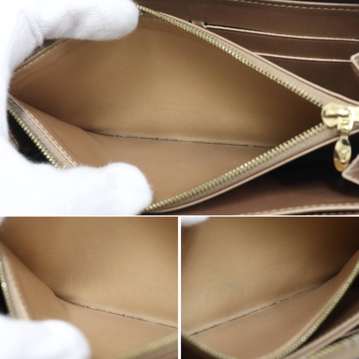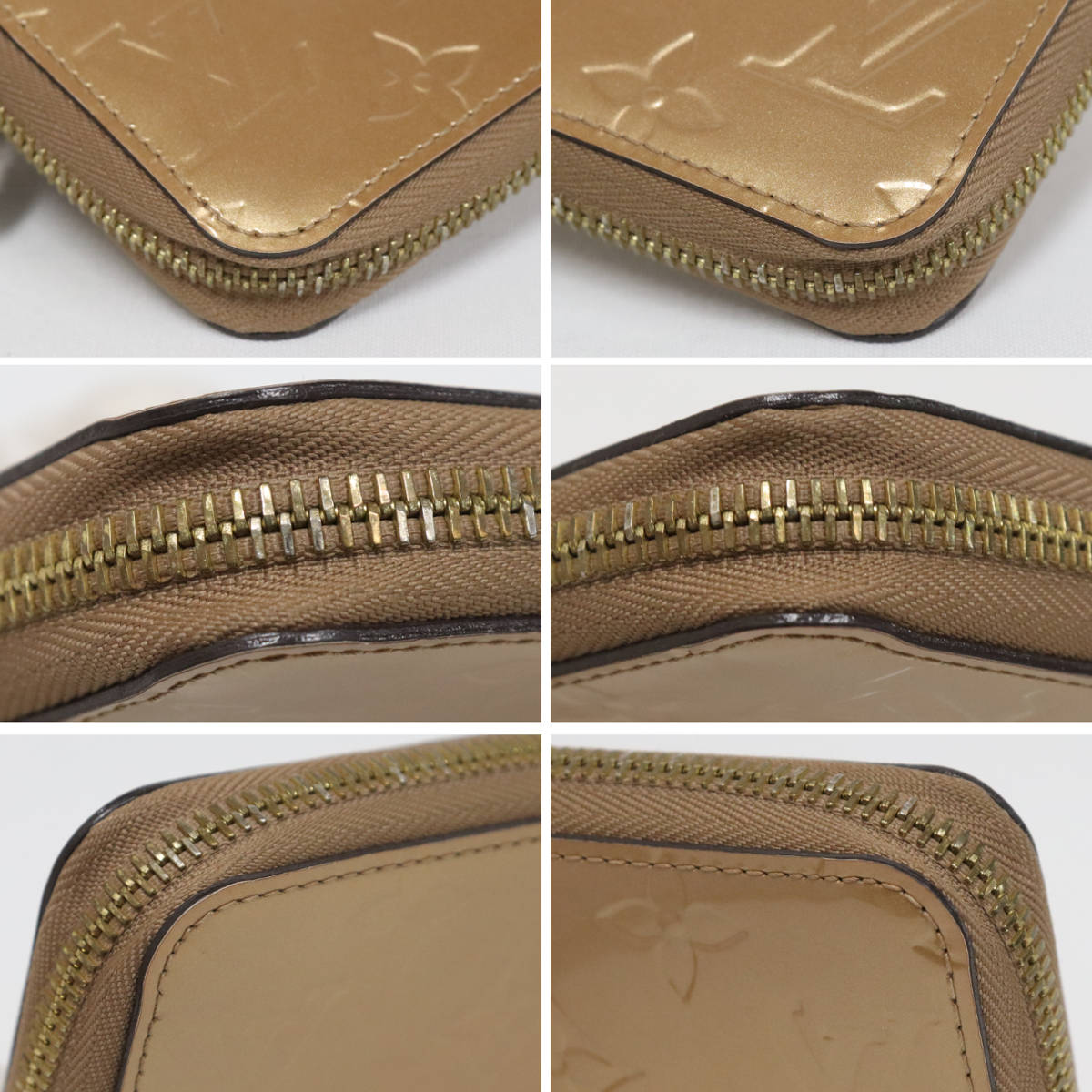 ルイヴィトンのモノグラム・ヴェルニのラウンドファスナー長財布、ジッピー・ウォレット ベージュプードル(M91761)の中古品です。