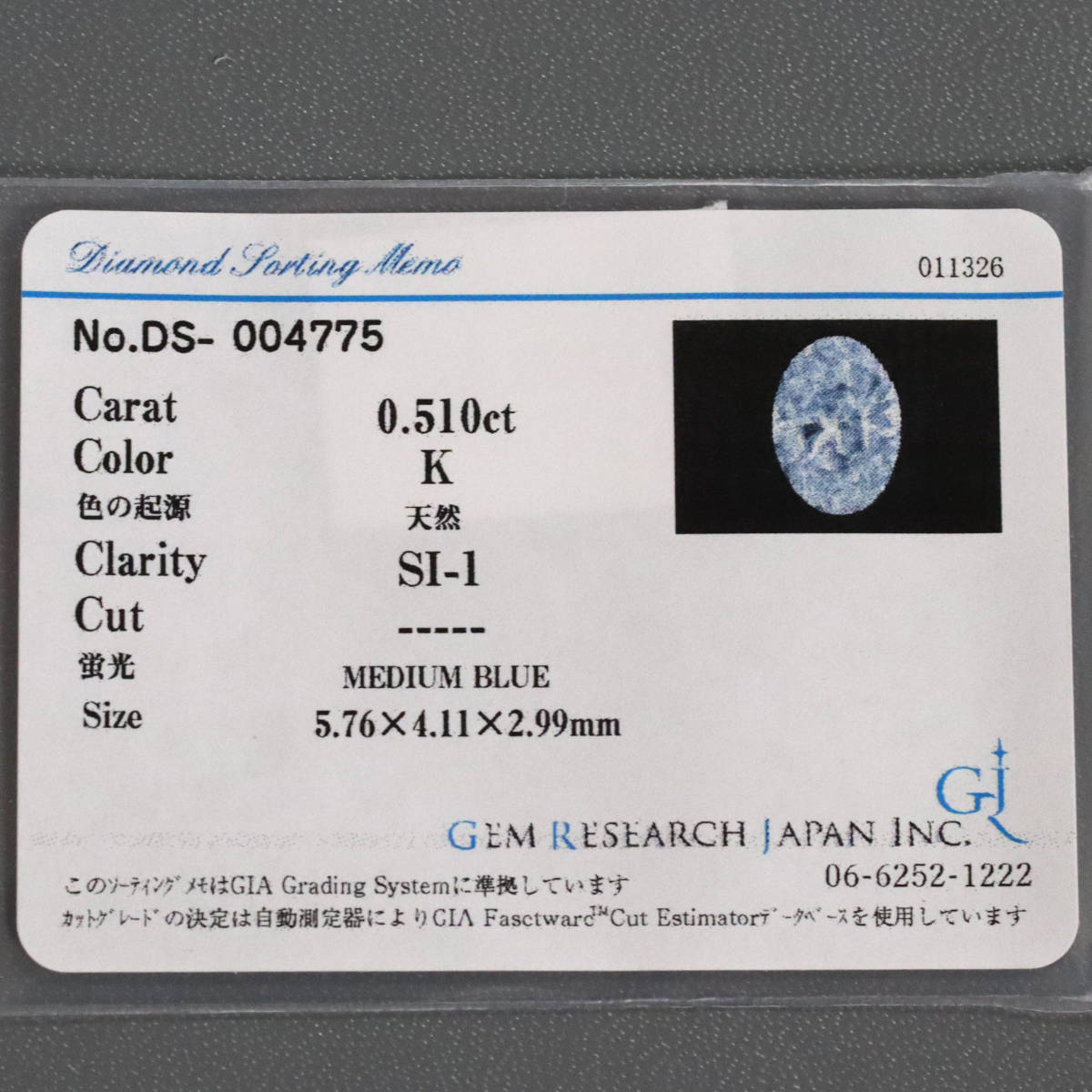 中石がカラーK、クラリティSI-1と認めるソーティングが付属します。