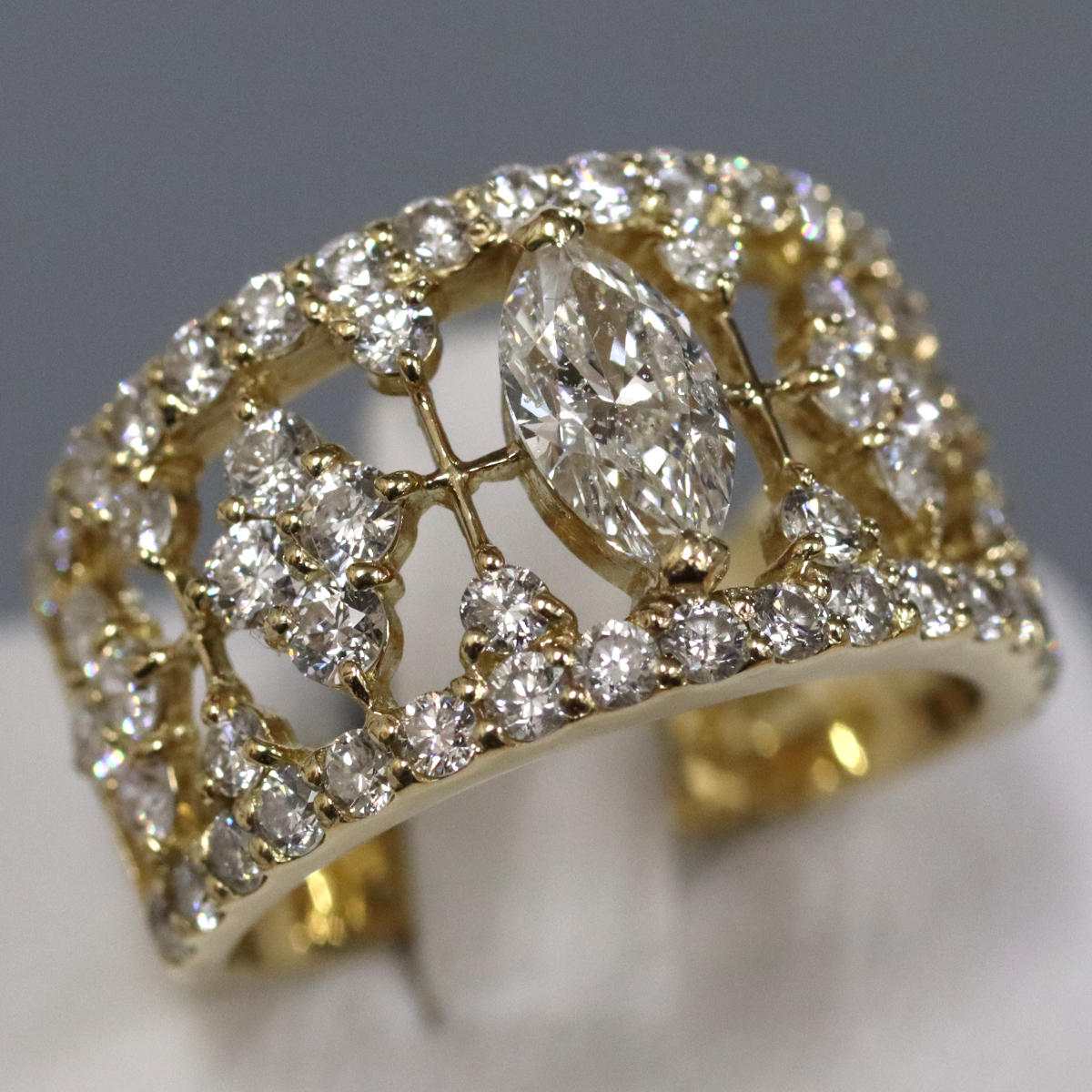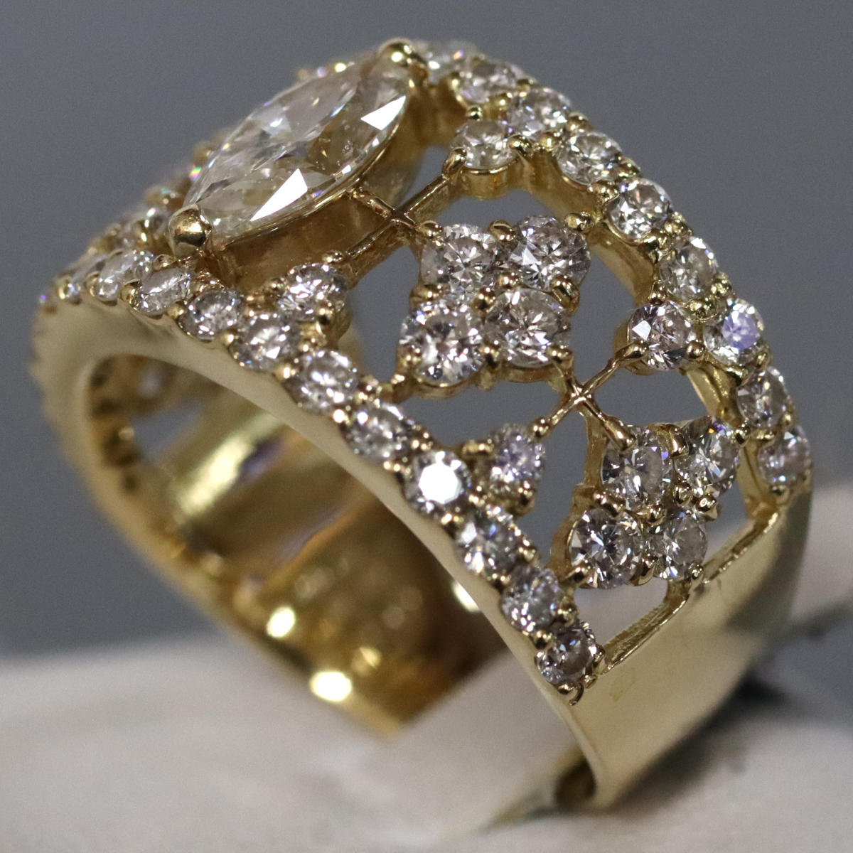 中石のマーキスカットはわずかに黄色がかった色味で、インクルージョンがありますが、照りよく輝きます。