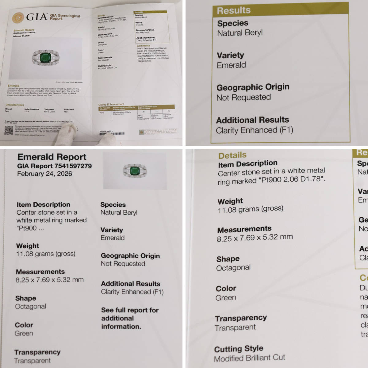 天然エメラルドと認めるGIA鑑定書が付属します。