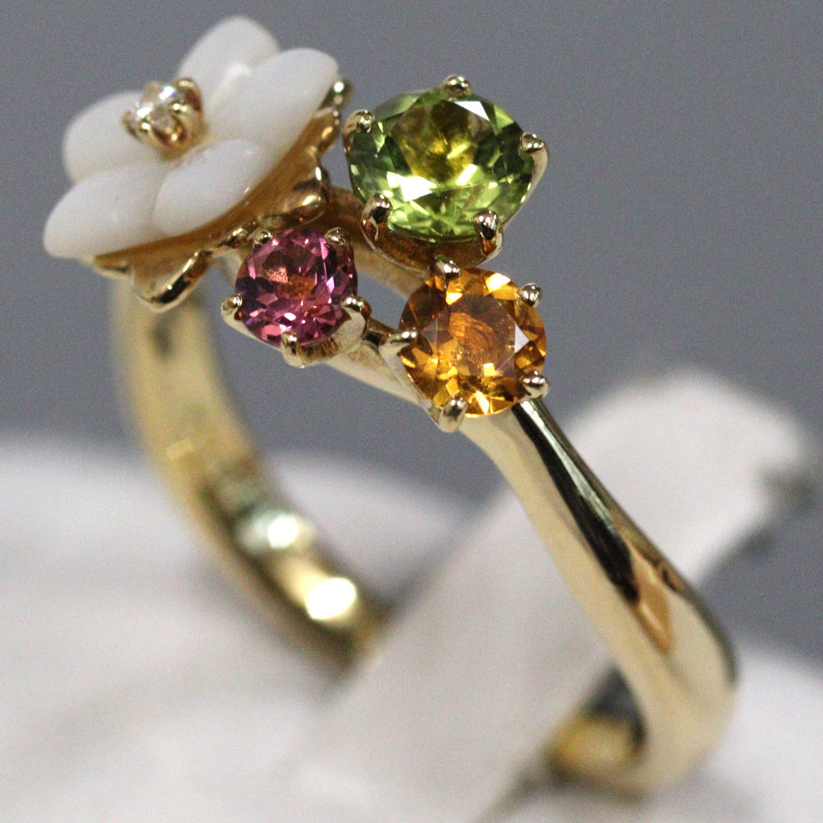 フラワー部分はホワイトシェルとダイヤモンドで、他にペリドット、シトリン、トルマリンがセットされています。