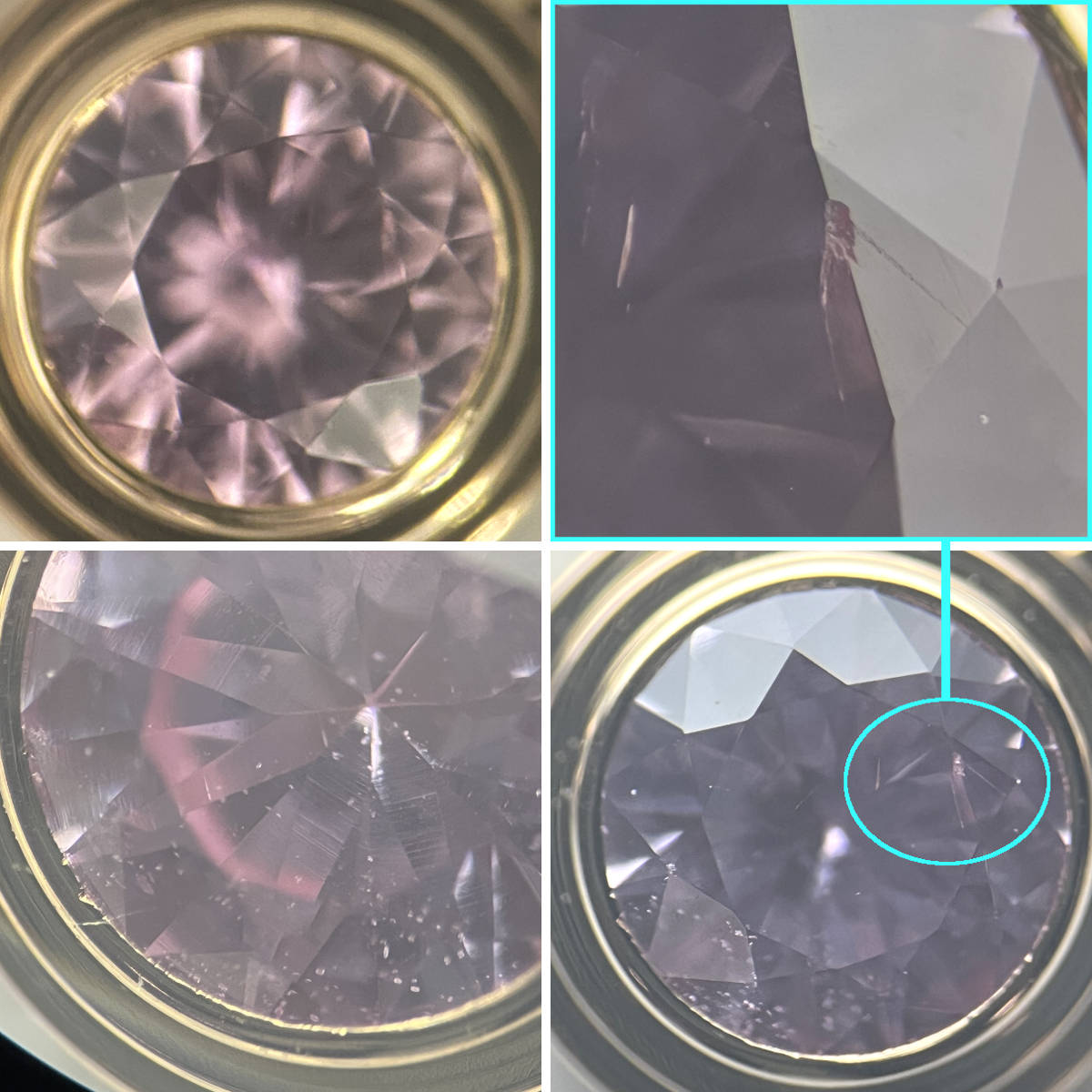 肉眼ではわかりませんが、ピンクサファイアのテーブル端に欠けがあり、ややインクルージョンがあります。(写真5枚目)