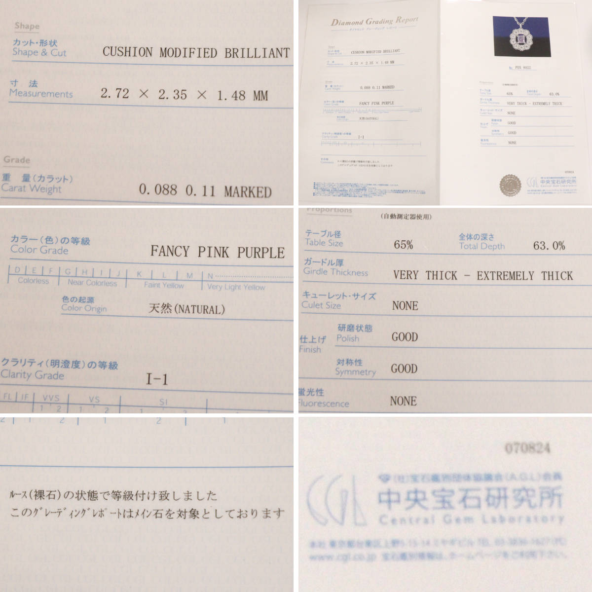 中石が天然のFANCY PINK PURPULE、クラリティI-1と認める鑑定書が付属します。