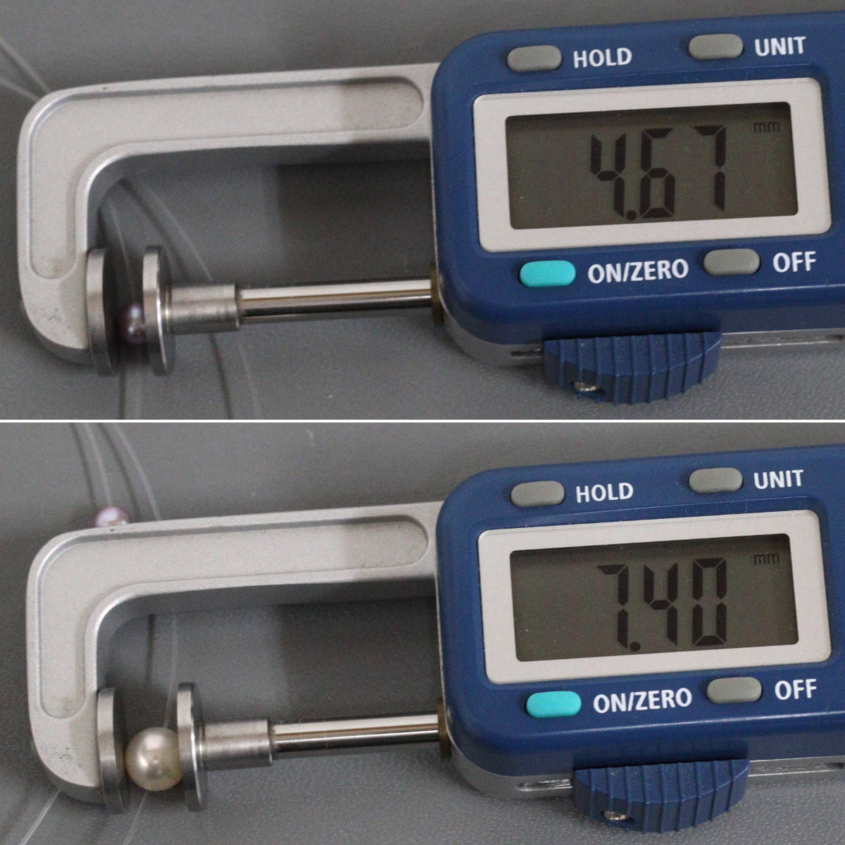 アコヤ真珠は約7.4mm、淡水パールは約4.6mmです。
