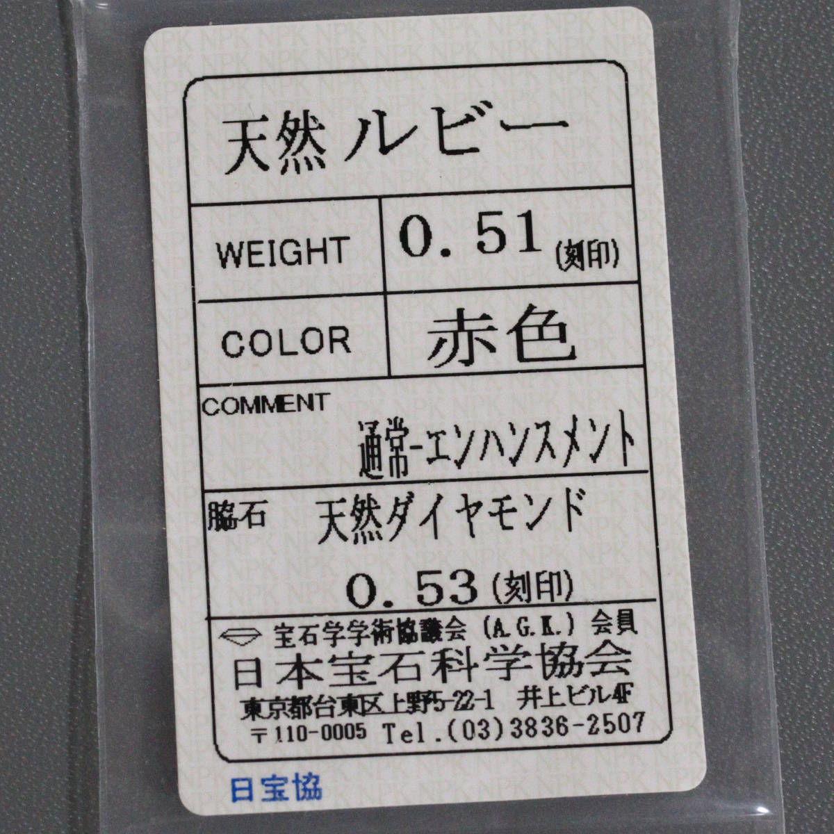 天然のルビー・ダイヤモンドと認めるソーティングが付属します。
