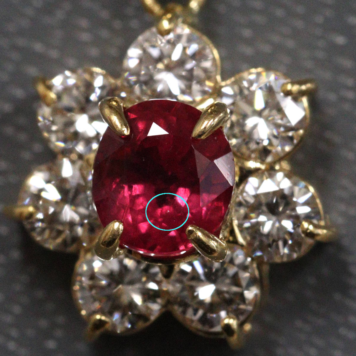 ルビーは彩度の高い赤色で、肉眼では見えませんがややインクルージョンがあります。